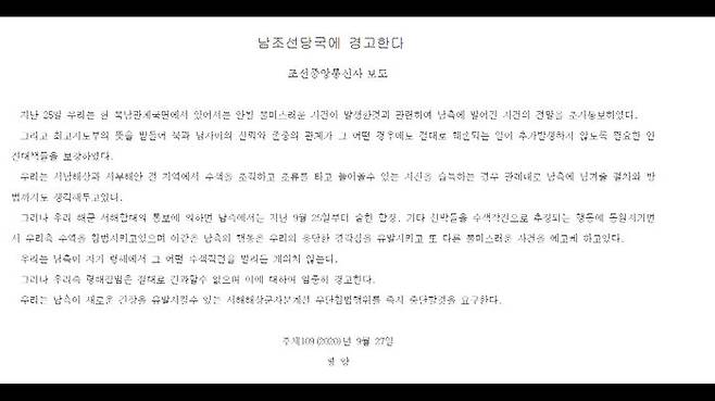 - 北 “남한, 실종 공무원 수색 작전 시 우리 영해 침범 중단해야”