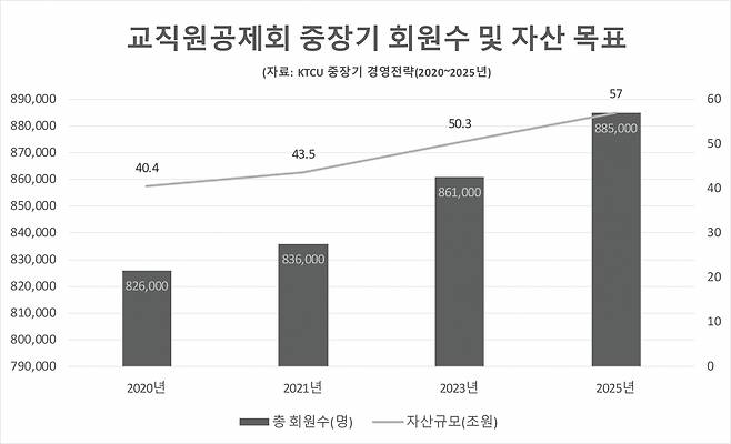 교직원공제회(KTCU)가 내부적으로 2025년까지 올해 자산을 57조원까지 늘리고 회원 수는 88만5000명으로 만들겠다는 계획을 세웠다.