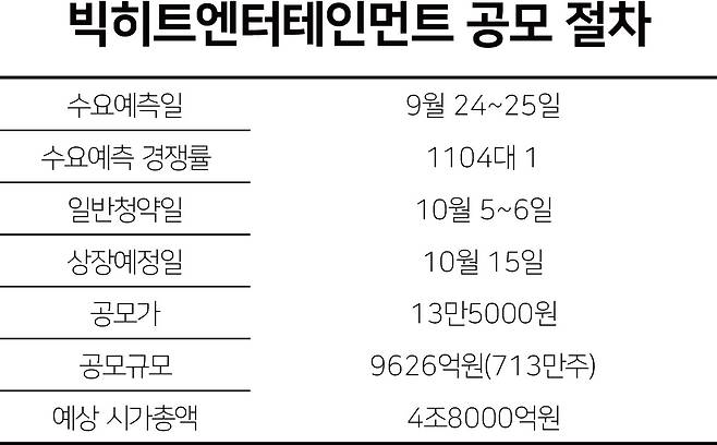 공모가는 밴드 상단인 13만5000원으로, 상장 당일 주가가 ‘따상’(공모가 2배로 시초가 형성 후 상한가로 상승)을 기록할 경우 35만1000원까지 오를 수 있다. 시가총액이 4조8000억원에서 출발해 12조5000억원까지 늘어날 수도 있다는 얘기다. 이는 1조원 안팎인 JYP(25일 종가 기준 1조2318억원), YG(9359억원), SM(7891억원) 엔터 3사를 모두 합친 것보다 많을 뿐만 아니라, 유가증권시장 20위권 진입도 가능한 수치다.