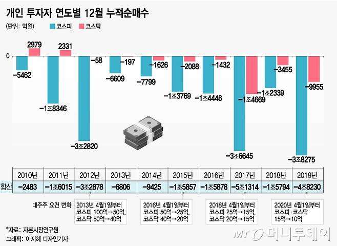 증권업계 관계자는 "9월은 개인들이 주식을 많이 파는 특성(최근 10년 평균 9365억원 순매도)이 있는데, 12월은 9월의 두 배가 넘는다"고 언급했다.