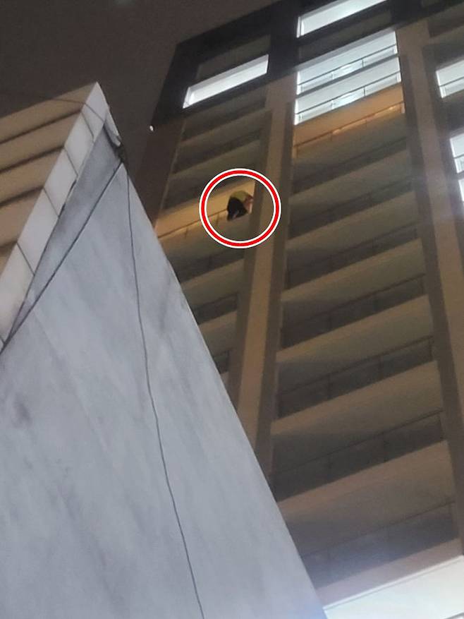 여기서 그치지 않고 몰래 숨겨온 술을 먹은 A씨는 호텔 14층 발코니 밖 난간에 매달려 난동을 부리기 시작했습니다.