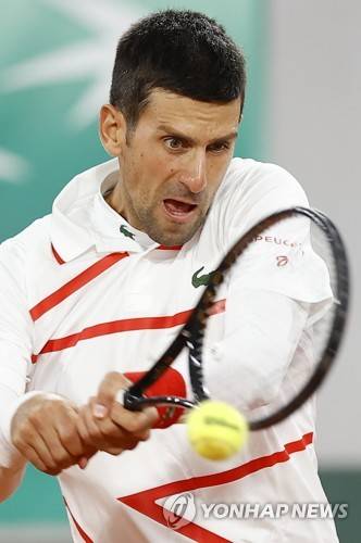 epa08706053 Novak Djokovic of Serbia hits a backhand during his first round match against Mikael Ymer of Sweden at the French Open tennis tournament at Roland Garros in Paris, France, 29 September 2020. EPA/IAN LANGSDON