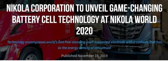 2019년 11월19일 니콜라는 시장을 바꾸어 놓을 배터리 기술을 공개하겠다고 발표했다. 2019년 10월부터 트레버 밀턴이 예고한 신개념 배터리를 2020년 니콜라 월드에서 발표하겠다는 것이다.