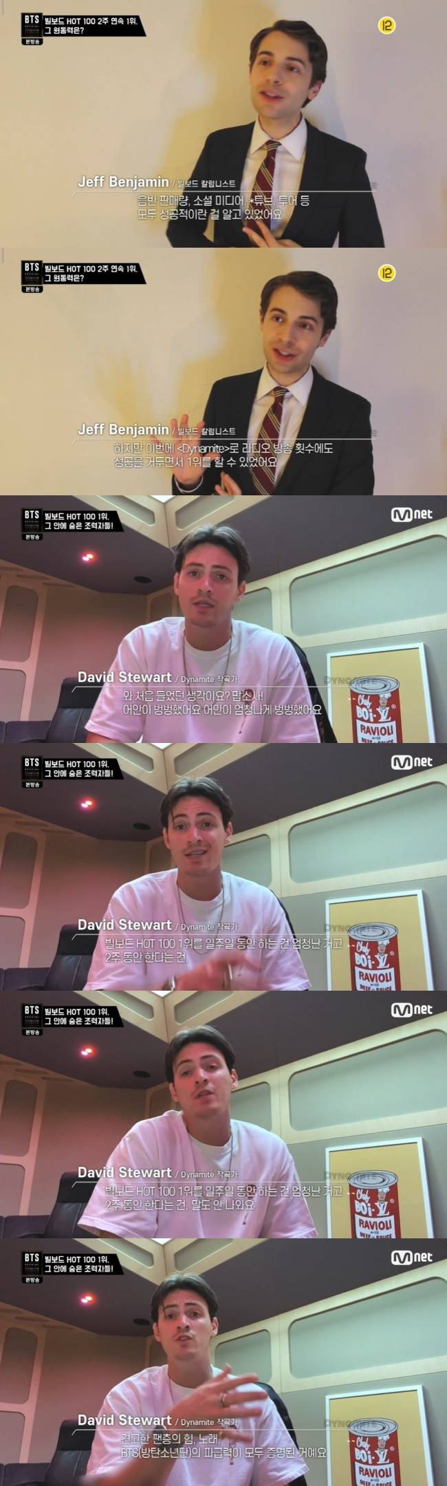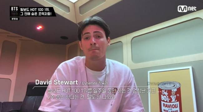 ‘Dynamite’의 작곡가 David Stewart “(빌보드 핫100 1위 소식을 처음 듣고)어안이 벙벙했다. 빌보드 핫100 1위를 일주일 동안 하는 건 엄청난 거고, 2주 동안 한다는 건 말도 안 나온다”며 “특히 요즘 같은 시대에 이 분야는 모든 게 휙휙 바뀐다. 견고한 팬층의 힘, 노래, BTS의 파급력이 모두 증명 됐다. 정말 대단하다. 완전히 미쳤다”고 말했다. (사진=Mnet 'BTS SPECIAL Dynamite' 방송 캡처)
