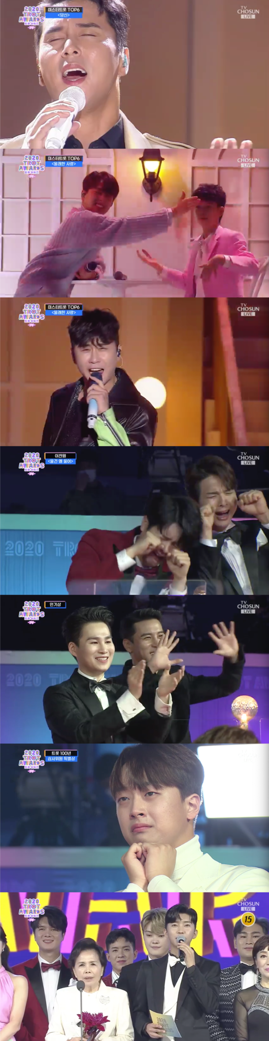 이찬원 ‘사랑은 나비인가봐’, 정동원 ‘나는 열입곱살이에요’, 장민호 ‘당신’, 영탁 ‘몰래한 사랑’, 김희재 ‘너무합니다’, 임영웅 ‘아내에게 바치는 노래’는 10무대 부럽지 않은 볼거리를 안겼고 이들이 다 같이 ‘오빠만 믿어’를 부를 땐 전국민의 코로나19 시름이 다 날아갔다.