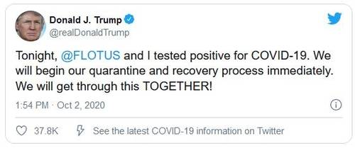 트럼프 대통령은 트위터에 "오늘 @FLOTUS(영부인 멜라니아 트럼프의 트위터 계정)와 내가 코로나19 양성 판정을 받았다. 우리는 격리와 회복 절차를 즉시 시작할 것이다. 우리는 함께 이를 극복할 것이다"라고 적었다.