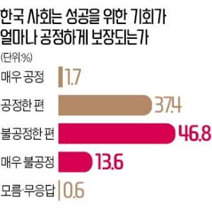 한국경제신문이 창간 56주년을 맞아 입소스에 의뢰해 시행한 여론조사에서 국민의 60.3%는 "사회·경제적 기회가 불공정하다"고 답했다.