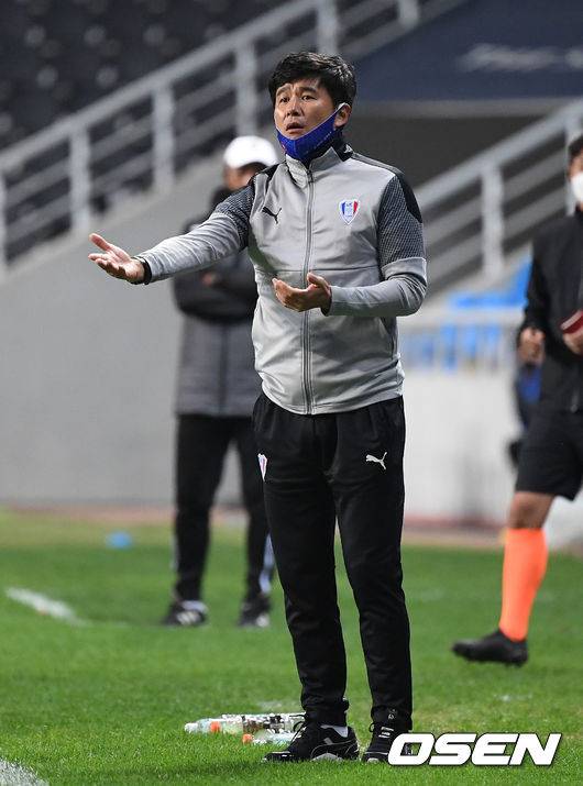 한석희 옐로 카드 판정에 어필하는 박건하 감독 [사진]