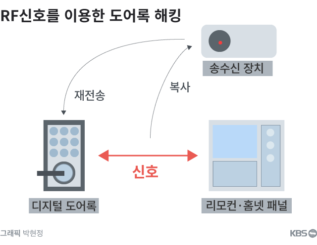 해킹 원리는 이렇습니다. 디지털도어록은 리모컨이나 홈넷 시스템이 구축된 홈넷 패널을 이용해 원격으로 문을 열 수 있습니다. 원격으로 연다는 것은 어떤 신호를 이용한다는 건데요. 쉽게 말해 이때 나오는 신호를 해킹 기계를 이용해 낚아채는 겁니다.