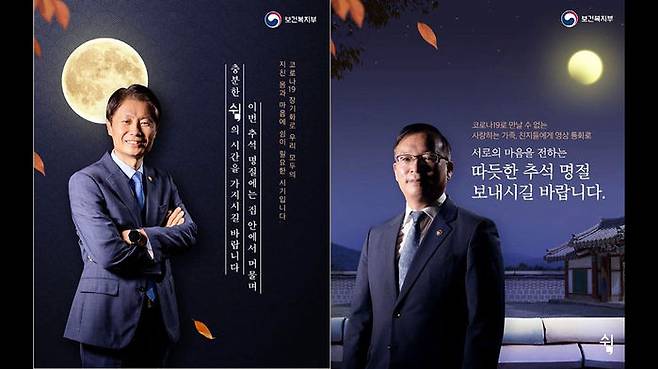 여기에는 보름달 뜬 밤하늘을 배경으로 박능후 장관과 김강립 1차관, 강도태 2차관의 사진이 전면에 배치돼 있고요. "추석 명절에도 코로나 방역에 최선을 다하겠다. 따뜻한 추석 명절을 보내라"는 인사말이 적혀 있습니다.