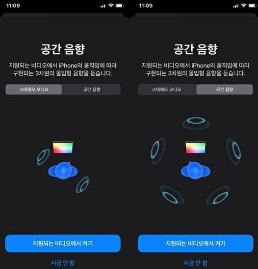 이어폰을 켜고 고개를 좌우로 돌리면 양쪽의 소리 크기가 달라진다. 이는 마치 영화관에서 영화를 볼 때의 사운드처럼 느껴진다. 에어팟 프로에 탑재된 자이로스코프와 가속도계로 사용자의 움직임을 감지하고, 기기에 있는 센서의 모션 데이터를 감지해 소리의 입체감과 공간감을 표현한다.