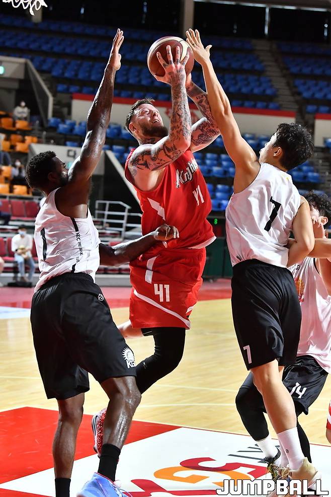 [점프볼=잠실학생체/홍기웅 기자] 5일 잠실학생체육관에서 열린 SK와 KGC의 연습경기. SK 닉 미네라스가 두 명의 수비사이로 골밑슛을 시도하고 있다.