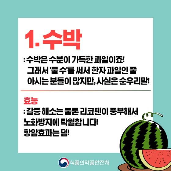 수박은 수분이 가득한 과일이죠! 그래서 물수를 써서 한자과일인 줄 아시는 분들이 많지만, 사실은 순우리말!