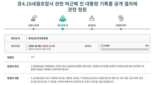 국민동의청원 내용은 4·16 세월호 참사와 관련한 박근혜 전 대통령의 기록물 공개 결의하는 것과, 사회적 참사의 진상규명 및 안전사회 건설 등을 위한 특별법(사참위법)을 개정하는 것입니다.