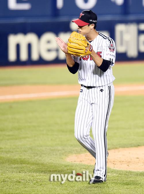 [마이데일리 = 곽경훈 기자] LG 이정용이 6일 오후 서울 잠실야구장에서 진행된 '2020 신한은행 SOL KBO리그' 삼성-LG의 경기 6회초 2사 2,3루에서 팔카를 내야 땅볼로 아웃시킨뒤 박수를 치고 있다.- ⓒ마이데일리(www.mydaily.co.kr). 무단전재&재배포 금지 -