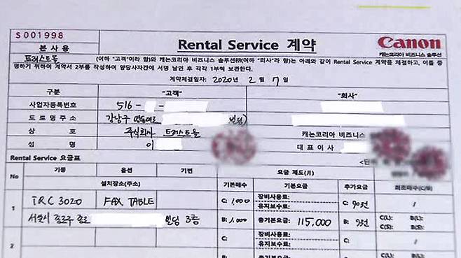SBS가 옵티머스 사건 관계자로부터 입수한 '트러스트올'과 캐논코리아 간 복합기 렌탈서비스 계약서입니다.