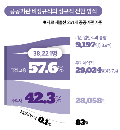구체적으로 43.7%(2만9,024명)의 정규직 전환자는 해당 공공기관에서 무기계약직으로 고용되며 비정규직 딱지를 벗어났다. 또 다른 42.3%(2만8,058명)는 원래 일하던 공공기관이 아닌 공공기관의 자회사 소속으로 다시 채용되며 정규직으로 재분류됐다. 83명은 사회적 기업 등 ‘제3의 방식’으로 분류됐다.