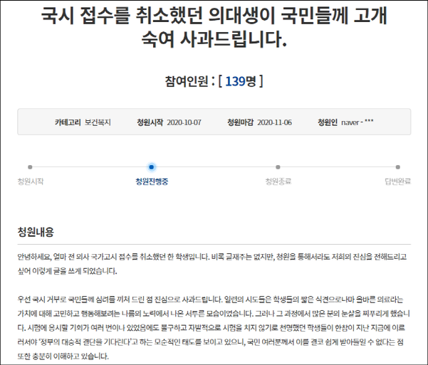 자신을 ‘얼마 전 국시 접수를 취소했던 한 학생’이라 밝힌 글쓴이는 이날 오전 청와대 국민청원 게시판에 ‘국시 접수를 취소했던 의대생이 국민들께 고개 숙여 사과드립니다’라는 제목의 청원 글을 올리고 국시 추가 응시가 필요하다고 주장했다.