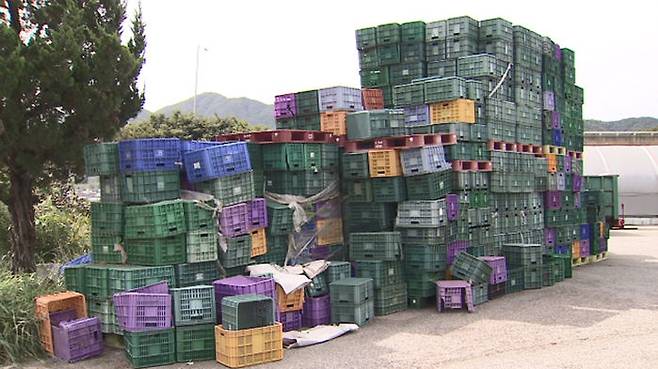 빈 배추 박스만 쌓여 있고 공장문은 굳게 닫혔습니다.