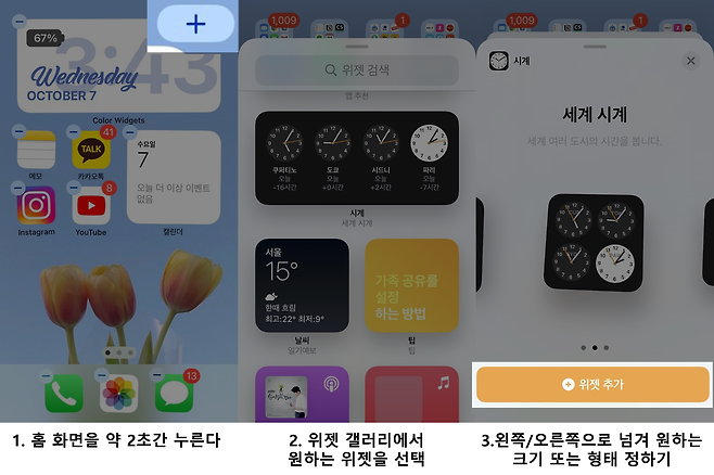 아이폰 화면 빈 영역을 앱이 흔들릴 때까지 약 2초간 누른다. 오른쪽 상단 모서리에 나타난 더하기(+) 버튼을 터치하면 위젯 갤러리가 생긴다. 위젯을 지원하는 앱을 많이 사용할수록 다양한 위젯이 나온다.