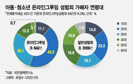 온라인그루밍 성범죄 사건에서 2030 연령대의 가해자 비중이 70%를 넘어서는 등 젊은층에 집중됐다.