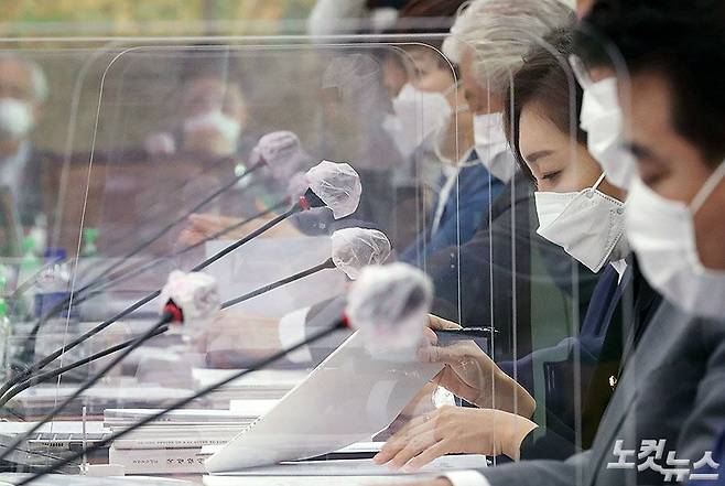 7일 국회 문화체육관광위원회의 문화체육부와 소속기관에 대한 국정감사에 출석한 의원들이 질문 자료를 검토하고 있다. 국회사무처는 코로나 방역을 위해 회의장 출입인원을 최소화하고, 방역조치를 강화했다. (윤창원 기자)