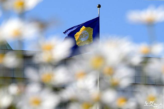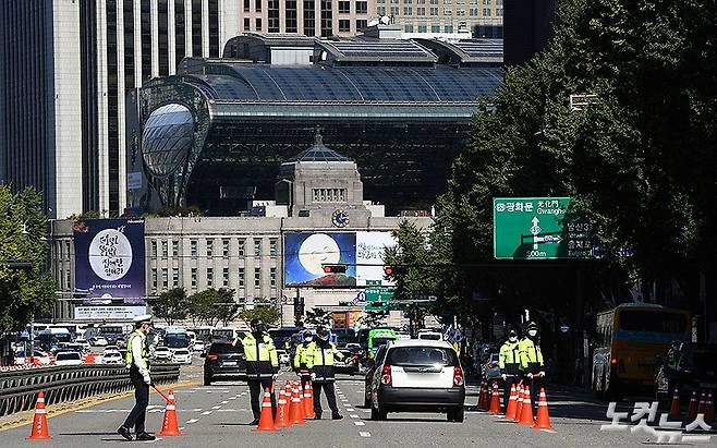 서울시가 한글날인 9일 도심지역 집회를 금지한 가운데 숭례문 앞에서 경찰들이 도심으로 향하는 차량검문을 하고 있다. (황진환 기자)