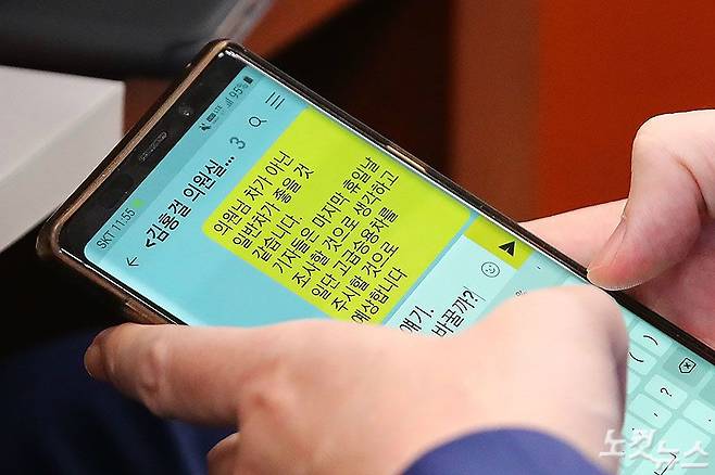 공직선거법 위반 혐의로 고발된 무소속 김홍걸 의원이 8일 국회 외교통일위원회의 통일부 등 국정감사 도중 휴대전화로 자신의 검찰 소환 일정과 관련해 변호사, 의원실 등과 언론 노출을 피할 방법 등을 논의하고 있다. (황진환 기자)