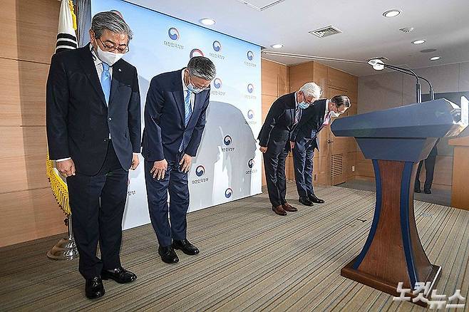 김연수 서울대병원장, 윤동섭 연세대의료원장, 김영훈 고려대의료원장, 김영모 인하대의료원장 등 주요대학병원장이 8일 정부서울청사에서 의과대학 본과 4학년생들의 의사 국가고시 미응시 문제와 관련해 사과 성명 발표에 앞서 인사하고 있다. (이한형 기자)