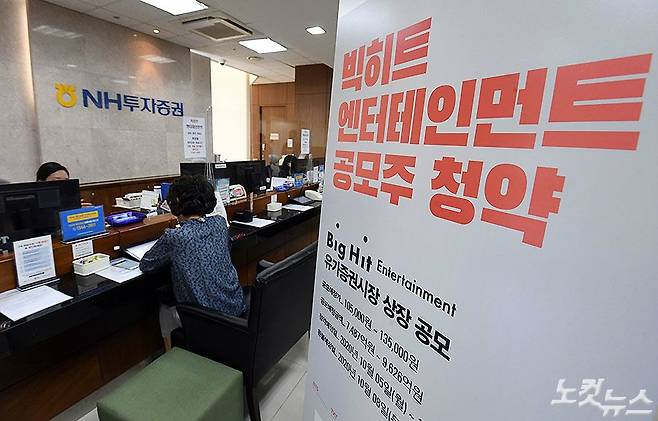 글로벌 아이돌그룹 방탄소년단(BTS)의 소속사 빅히트엔터테인먼트 공모주 청약 첫날인 5일 오후 서울 마포구 NH투자증권 마포WM센터에서 개인투자자들이 청약을 위해 상담을 하고 있다. 빅히트 공모주 청약을 주관한 증권사 4개사가 최종 집계한 최종 증거금은 58조 4236억 9755만원으로 역대 청약 증거금 1위를 기록한 카카오게임즈에 약 1천만원 차이로 역대 청약 증거금 2위를 기록했다. (황진환 기자)