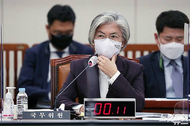 강경화 외교부 장관이 7일 국회 외교통일위원회의 외교부에 대한 국정감사에서 의원들의 질의를 듣고 있다. 강 장관은 “남편의 해외 출국 경위를 떠나서 매우 송구스럽게 생각한다”고 고개를 숙였다. 이어 “개인사이기에 말씀드리기 참 뭐합니다만 (남편은) 제가 말린다고 말려질 사람이 아니고요…”라고 답해 외통위 의원들 대다수가 웃음을 보였다. (윤창원 기자)
