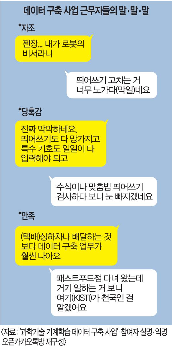 지난 25일 대전 KISTI 사무실 작업장에서 만난 지창우(30)씨도 중소기업 퇴사 후 다시 취업을 준비하면서 데이터 구축 사업에 참여했다. 지씨는 “AI와 빅데이터에 대한 사회적 관심이 높아지면서 관련 분야 경험을 쌓기 위해 지원했다”며 “‘기계학습 데이터 구축’이라고 해서 새로운 지식을 배우길 기대했는데 생각보다 단순한 작업이 주어졌다”고 말했다. 이어 “보수나 처우 자체는 만족스럽지만 기간이 4개월로 짧아 아쉽다. 당장 일자리가 없어 생계가 어렵다면 지원해볼 만하다고 생각한다”고 말했다.