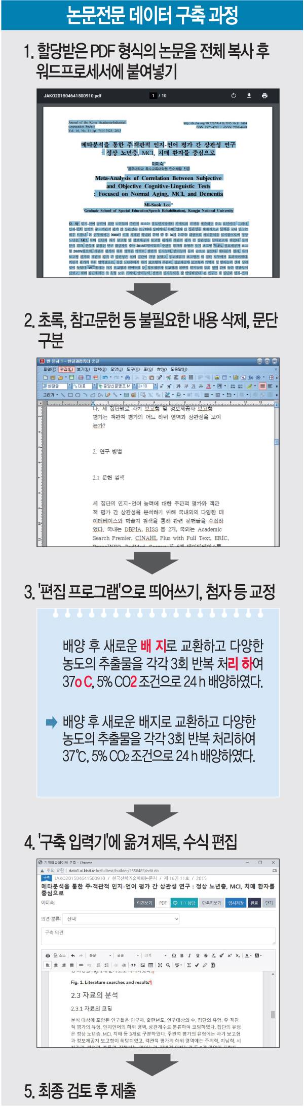 AI용 데이터를 구축하는 데 고도의 컴퓨터 활용 능력은 필요없었다. 일의 순서는 이랬다. 먼저 할당받은 PDF 논문을 전체 복사해 편집기로 옮긴다. 논문 초록과 참고문헌 등 불필요한 내용 및 서식은 삭제한다. 제목과 문단, 캡션 등을 통일된 양식으로 정리하고, 깨진 각주나 첨자, 특수기호를 알맞게 수정한다. 다단별로 나눠진 본문을 편집하는 과정에서 필연적으로 생기는 수백 개의 띄어쓰기 오류는 수작업으로 일일이 잡아내야 한다. ‘복사, 붙여넣기, 편집’이 업무의 전부였다.