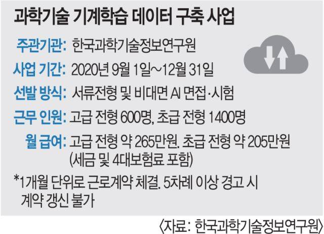 기자는 9월 1일부터 한 달간 한국과학기술정보연구원(KISTI)의 데이터 구축 일자리에 ‘취업’해 일했다. 정부는 ‘디지털 뉴딜’ 사업의 일환으로 인공지능(AI)의 학습을 위한 데이터 댐 구축을 추진하고 있다. KISTI는 같은 목적으로 과학기술 기계학습 데이터 구축 사업을 진행하고 있다. 9월부터 12월까지 국내 과학기술 논문 및 연구·개발(R&D) 보고서를 정리해 기계학습 데이터 425만7000건(5종류)을 만드는 일이다. 사업비는 약 296억원으로 인건비에만 258억원이 책정됐다. KISTI는 이 사업에 필요한 단기 계약직 근무자 2000명을 선발했다.