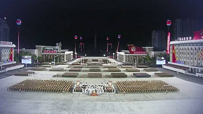 대낮처럼 밝힌 김일성 광장에서 진행된 열병식에는 22개 기계화 부대 등 총 75개 열병 중대가 참가했습니다.