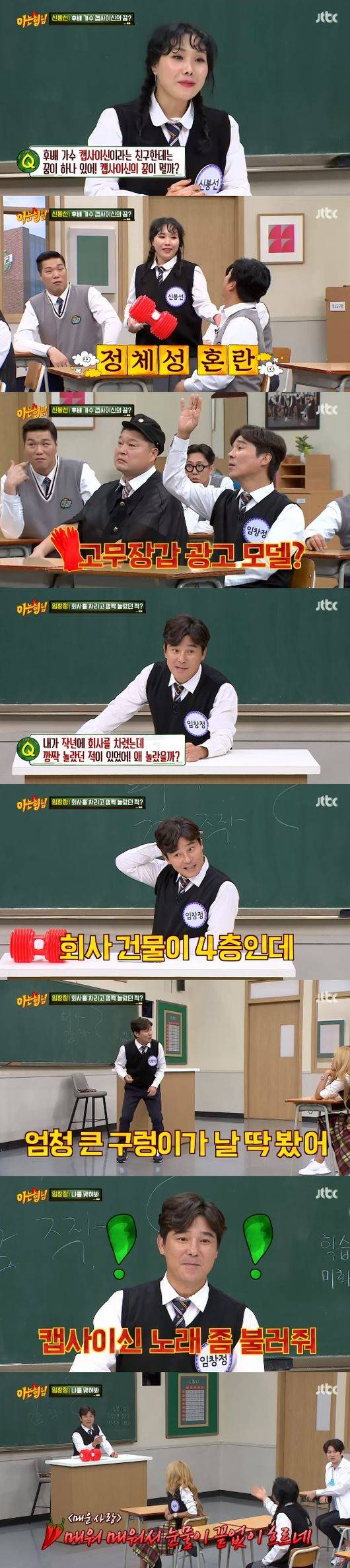 이에 신봉선은 "그 분은 내가 정말 존경하는 선배다"라고 일축했다. 임창정이 "고무장갑 광고"라고 말해 정답을 맞혔다. 이에 신봉선은 "캡사이신이 김치 광고하면서 고무장갑 광고를 했으면 하더라. 사실 캡사이신이 언제까지 할게 될지 모르겠어"라고 이야기했다.