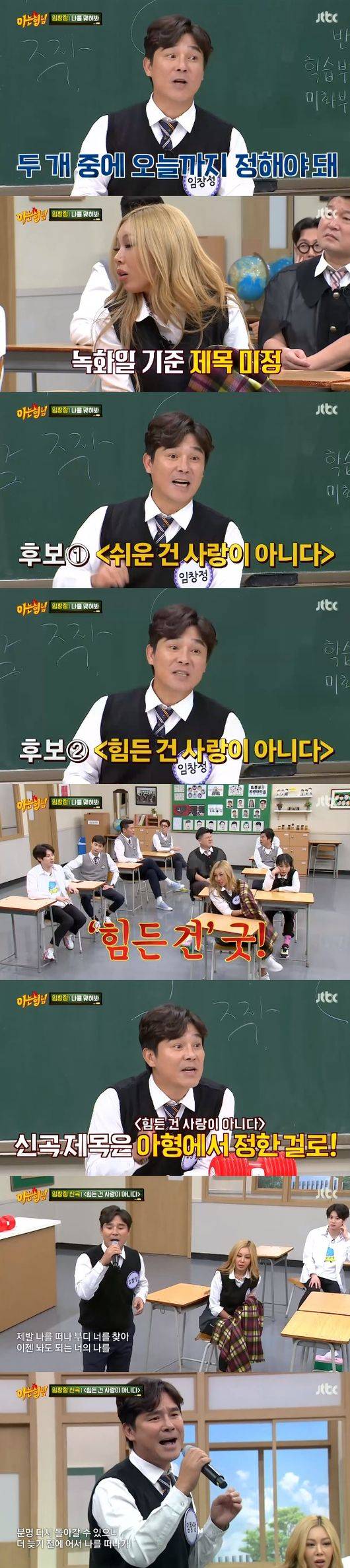 이에 아형 멤버들은 만장일치로 '힘든 건 사랑이 아니다'를 골랐다. 이에 임창정은 "그럼 아형에서 신곡 제목을 정한 거다"고 말한 뒤 신곡을 불렀다.