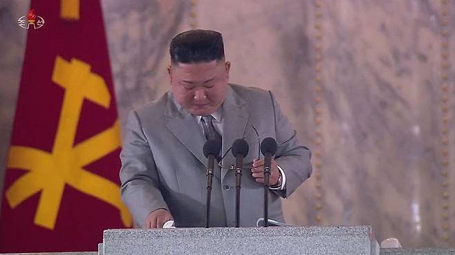 북한이 10일 노동당 창건 75주년 기념 열병식을 열었다고 조선중앙TV가 보도했다. 회색 양복을 입은 김정은 위원장이 연설을 하던 중 재난을 이겨내자고 말하며 울컥한 듯 안경을 벗고 눈물을 훔치고 있다.
