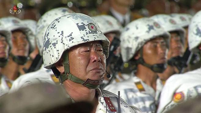 북한이 10일 노동당 창건 75주년 기념 열병식을 열었다고 조선중앙TV가 보도했다. 북한군이 김정은 위원장의 연설을 들으며 눈물을 흘리고 있다. 참가자들은 모두 마스크를 쓰지 않은 모습이다.