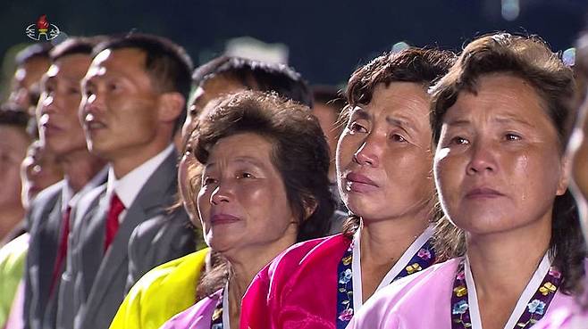 북한이 10일 노동당 창건 75주년 기념 열병식을 열었다고 조선중앙TV가 보도했다. 광장에 모인 주민들이 김정은 위원장의 연설을 들으며 눈물을 흘리고 있다. 참가자들은 모두 마스크를 쓰지 않은 모습이다.