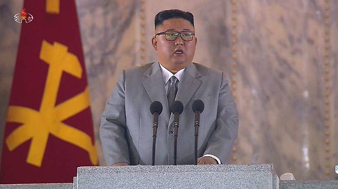 북한이 10일 노동당 창건 75주년을 맞아 열병식을 개최했다. 회색 양복을 입은 김정은 위원장이 연설하고 있다.