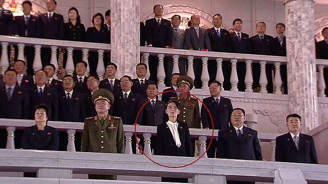 북한이 노동당 창건 75주년을 맞아 10일 자정 무렵부터 열병식을 진행했다. 김여정 제1부부장(붉은 원)도 열병식에 참석했다. 이날 광장에 모인 당 간부들과 주민들은 모두 마스크를 쓰지 않은 채였다.