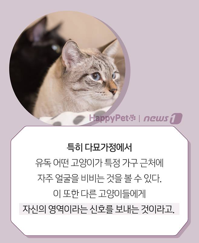 특히 다묘가정에서 유독 어떤 고양이가 특정 가구 근처에 자주 얼굴을 비비는 것을 볼 수 있다. 이 또한 다른 고양이들에게 자신의 영역이라는 신호를 보내는 것이라고.