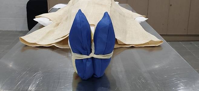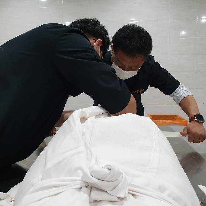 | ▲ 염습실 내부. 두 장례지도사가 염습을 하고 있다. |