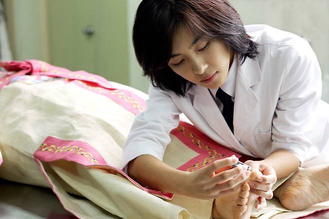 | ▲ "조만간 화장, 매장되어 자연으로 분해될 신체지만 이승을 떠나는 순간만큼은 온전한 형태로 보내고픈 장례지도사들의 배려다." 영화 <내 사랑 내 곁에>의 한 장면. |