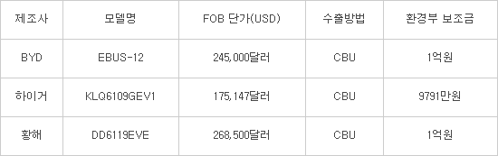 정부가 지원하는 전기버스(대형·저상버스 기준) 국가 보조금은 차량당 대부분 3억원으로, 중국 업체가 중국 당국(해관)에 신고한 수출가보다 우리 정부가 지원하는 보조금이 더 많은 셈이다.