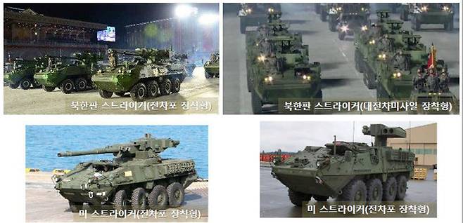 이번 열병식에서 처음 등장한 북한판 스트라이커 장갑차는 미군 스트라이커와 유사합니다.