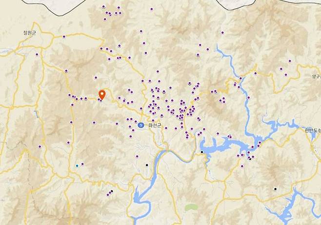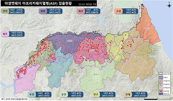 보라색 점은 ASF에 걸린 멧돼지 또는 멧돼지 폐사체 발견지점입니다. 이 사진을 보고 댓글에는 "1년여 동안 버틴 것만 해도 신기하다"라는 말이 달렸습니다. 그만큼 주변에 멧돼지 ASF 바이러스가 도사리는 가운데 고군분투했다는 의미입니다.