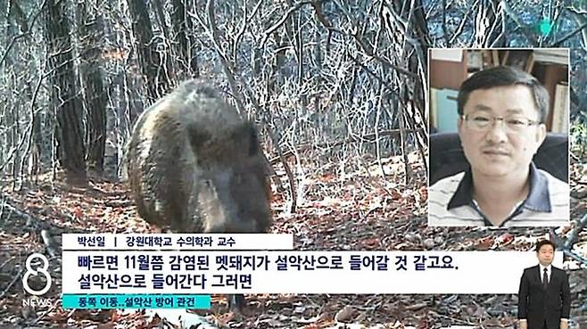 강원대학교 수의학과 박선일 교수는 화천 ASF 발생을 두고 예견된 일이라고 말합니다. 그러면서 앞으로의 걱정은 설악산 국립공원이 뚫리는 경우라고 지적합니다. 박선일 교수는 지난 멧돼지 ASF 발견 장소를 분석했더니 빠르면 11월쯤 설악산 국립공원 내 멧돼지 폐사체에서도 바이러스가 검출될 것이라고 경고합니다.