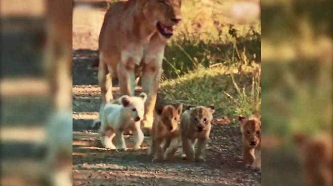 어미 사자 옆으로 아기 사자들이 따라가는데요, 그중에 온몸이 새하얀 백사자 한 마리가 눈에 띄죠?